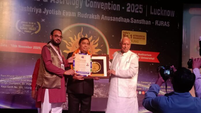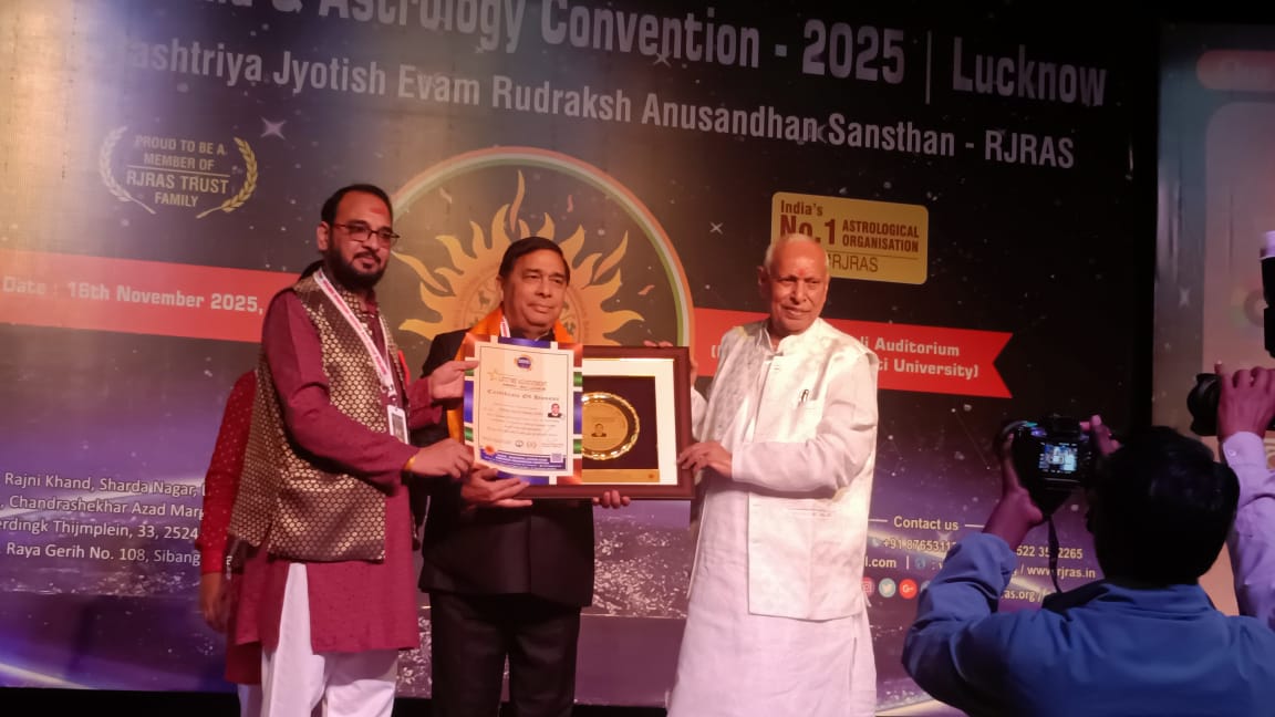 राष्ट्रीय ज्योतिष एवं रुद्राक्ष अनुसंधान संस्थान लखनऊ के तत्वावधान में 16 नवम्बर, 2025 को सनातन धर्म एवं एस्ट्रोलाॅजी कन्वेंशन – 2025 का उमा नाथ बलि सभागार (भातखण्डे संस्कृति विश्वविद्यालय) में भव्य आयोजन किया गया । सर्वप्रथम सभी अतिथियों के शुभागमन पर सभागार के प्रवेश द्वार पर वैदिक रीति से विधिवत संस्था द्वारा पट्टिका एवं तिलक सहित स्वागत किया गया । तत्पश्चात कन्वेंशन का शुभारंभ परम्परा अनुसार विद्वान आचार्यों द्वारा स्वास्ति वाचन तथा विद्या की देवी माॅं सरस्वती के चित्र पर पुष्प अर्पित करने से किया गया । इस अवसर पर कन्वेंशन में देश के सुप्रसिद्ध ज्योतिषाचार्य श्री के. ए. दुबे पदमेश एवं श्री इंदु प्रकाश तथा साथ ही देश-विदेश से पधारे हुए कई प्रमुख ज्योतिषाचार्यों एवं प्रसिद्ध विद्वानों ने भी भाग लिया और अपने-अपने सारगर्भित विचारों एवं विशेष ज्योतिषीय सूत्रों के माध्यम से सभागार में उपस्थित सभी सम्माननीय सदस्यों का ज्ञानवर्धन किया । इसके उपरांत सभागार में उपस्थित संस्था के आजीवन सदस्यों एवं आमंत्रित सभी विद्वानों को पूर्व सुनिश्चित की गई श्रेणियों के क्रमानुसार सम्मानित किया गया । इसी क्रम में संस्था के दिल्ली प्रदेशाध्यक्ष एवं इस कन्वेंशन के संयोजक आचार्य सुरेश शर्मा और संस्था के राष्ट्रीय सलाहकार एवं प्रसिद्ध विद्वान पं. सुरेश गौड़ सुमेरपुर (राज.) को लाइफ टाइम अचीवमेंट अवाॅर्ड से सम्मानित किया गया । आचार्य सुरेश शर्मा को इससे पूर्व भी भगवान परशुराम राष्ट्रीय पंडित परिष्द ट्रस्ट द्वारा कोलंबो श्रीलंका में जुलाई 2024 में तथा न्यू एरा प्रेस दिल्ली द्वारा दिसम्बर, 2024 में लाइफ टाइम अचीवमेंट अवाॅर्ड से सम्मानित किया जा चुका है । कन्वेंशन पूर्ण रूप से संस्था के राष्ट्रीय अध्यक्ष श्री पंकज त्रिवेदी के कुशल नेतृत्व और उचित मार्गदर्शन में कार्यरत उनकी कर्मठ और समर्पित टीम के अथक सद्प्रयासों से ही सफल तथा अत्यंत सौहार्दपूर्ण वातावरण में सम्पन्न हुई ।