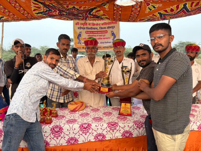 रिपोर्टर कानाराम घांची, राजस्थान, जोधपुर, दईपड़ा खींचीयान समापन समारोह मे एडवोकेट अशोक जी पटेल पुर्व सरपंच मदन जी पटेल बुथ अध्यक्ष जितेंद्र सिंह खींची पंचायत समिति सदस्य के प्रतिनिधि जेटू सिंह खींची ठाकुर स्वरूप सिंह बालावत आम सिंह धाधल अनूप सिंह धाधल तेज सिंह सोलंकी रेवत सिंह सांखला पर्वत सिंह खींची चंदन सिंह खींची मूल सिंह सोलंकी युवराज सिंह सोलंकी ईश्वर सिंह राठौड़ समुद्र सिंह राठौड़ मनोहर सिंह खींची मोड़ सिंह सांखला करण सिंह सोलंकी नरपत सिंह पडियार भूर सिंह सांखला अनूप सुथार जालम सिंह सोलंकी सोहन सिंह खींची सोनाराम मेघवाल गोविंद राम भील शंकर राम घांची चंपालाल घांची केवल राम घांची रूपाराम जी सुथार बाबूलाल जी सुथार उम्मेद सिंह जी बालावत भंवर लाल सुथार जसवंत चारण समस्त ग्रामीण वालों की मौजूदगी में ट्रॉफी विजेता टीम के कप्तान गोविंद सिंह उप कप्तान ईश्वर सिंह धर्मेंद्र सुथार अनूप सुथार सुरेंद्र सिंह सुनील अनूप सिंह कुंभ सिंह स्वरूप सिंह हिमांशु शंभू सिंह को ट्रॉफी मेडल से सम्मानित किया गया उपविजेता टीम के कप्तान सुरेश सुथार ट्रॉफी से सम्मानित किया गया गौ रक्षक टीम ने गाँव मे गाय मे बीमारी लीची मुख रोग से 100 पशु को बसाया निखिल सिंह खींची जितेंद्र सिंह प्रवीण सिंह करण सिंह सुनील अरविंद सिंह राजू सिंह स्वरूप सिंह लोकेंद्र सिंह को मेडल से सम्मानित किया भामाशाह तेज सिंह सोलंकी का साफा पहनाकर सम्मानित किया गया