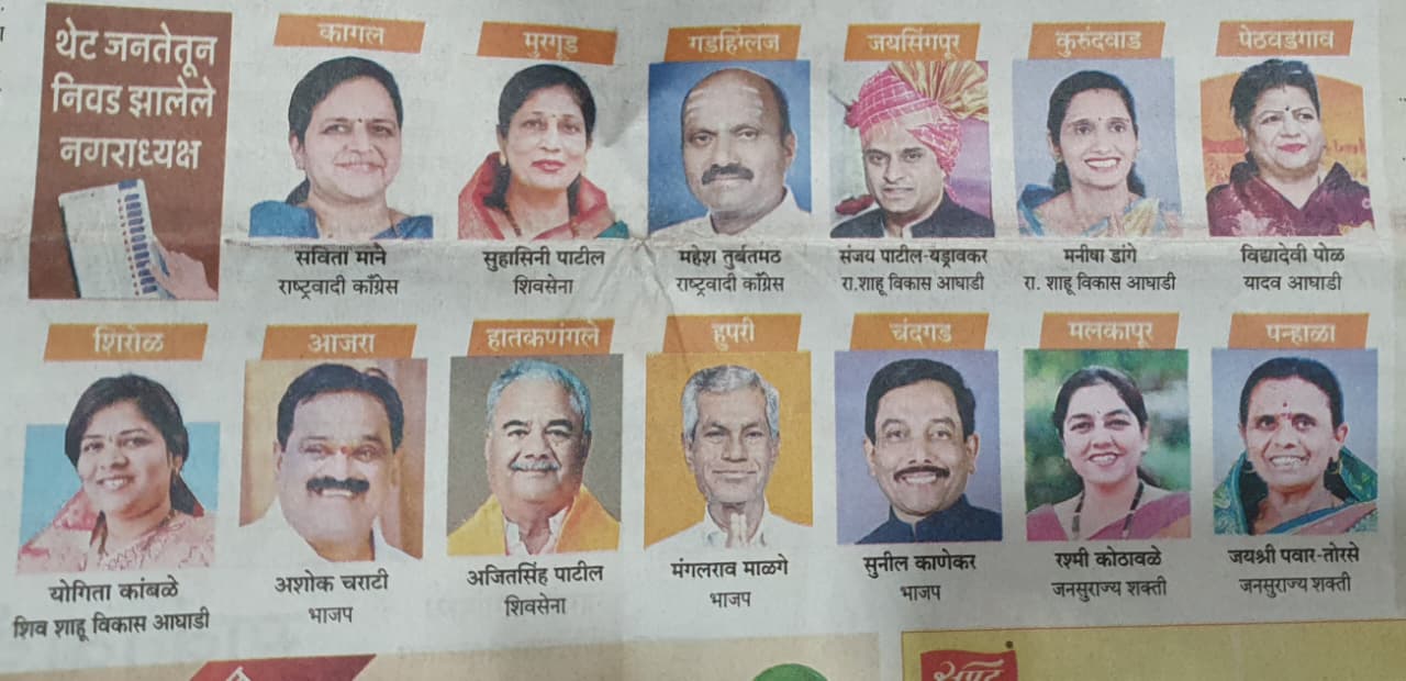 रिपोर्टर : शितल गुरव, हुपरी, कोल्हापूर, महाराष्ट्र, माविया में केवल दो नगरपालिकाएं हैं: शिंदे (शिव सेना 4), भाजपा 3, एनसीपी 2, जनसुराज्य 2)।