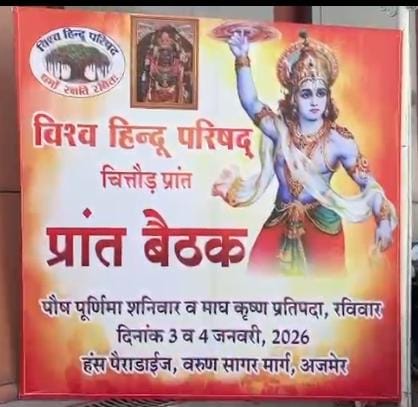 रिपोर्टर-संदीप कुमार वैष्णव, विश्व हिंदू परिषद चित्तौड़ प्रांत की 2 दिवसीय बैठक का आयोजन अजमेर के वरुण सागर रोड स्थित हंस पैराडाइज समारोह स्थल में किया गया। बैठक में चित्तौड़ प्रांत के विभिन्न जिलों से आए पदाधिकारियों ने बैठक में शिरकत करते हुए कई महत्वपूर्ण मुद्दों पर चिन्तन कर आगामी कार्यक्रमों की रूप रेखा तैयार की । बैठक के बाद विश्व हिंदू परिषद के प्रमुख पदाधिकारियों ने प्रेस कॉन्फ्रेंस कर पिछले माह हस्तिनापुर में संपन्न हुई केंद्रीय प्रन्यासी मंडल की बैठक में पारित 4 प्रस्तावों को धरातल पर ले जाने की रूपरेखा बताई ।